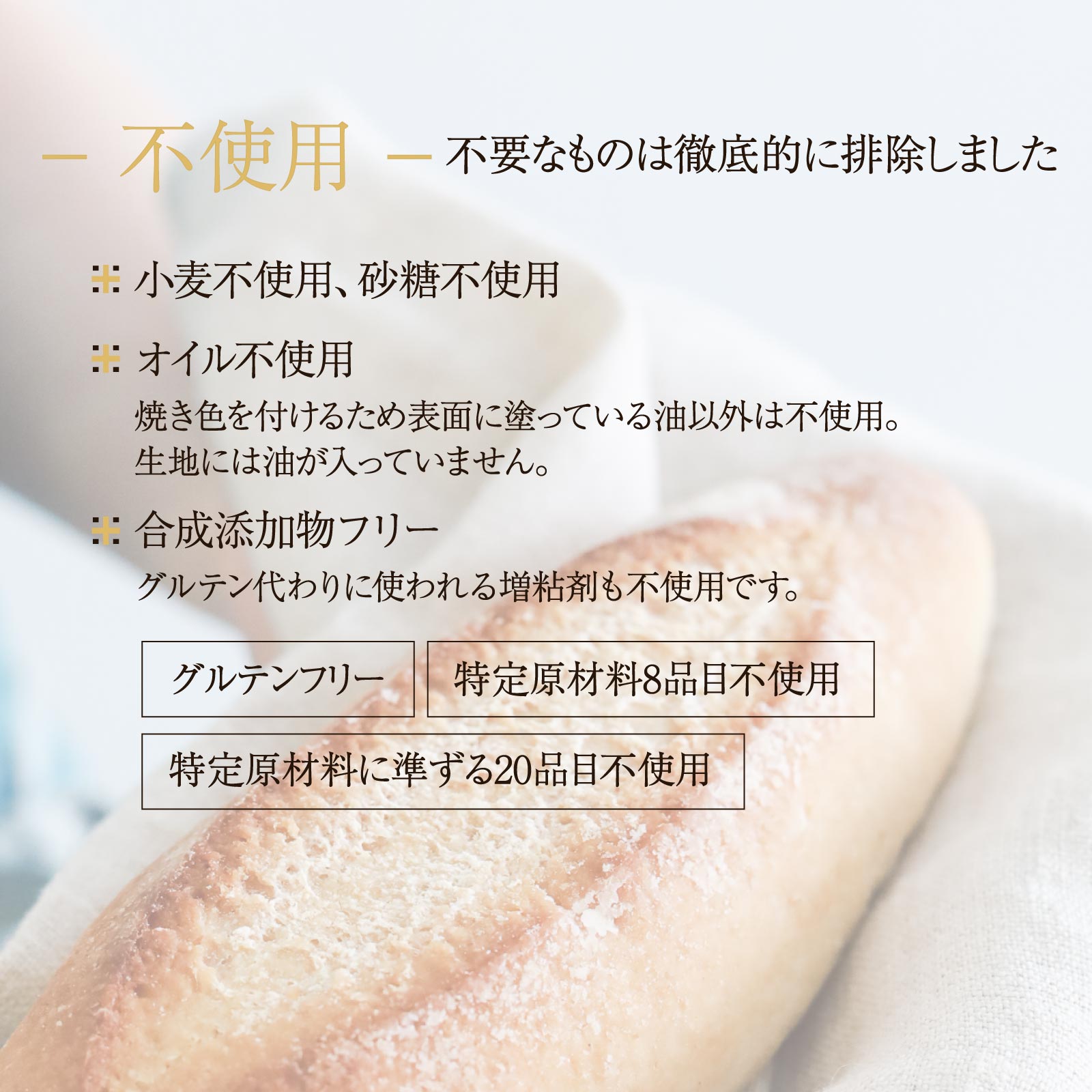 | 原材料名 | 国産玄米粉(コシヒカリ)、有機コーンス ターチ、有機アガべシュガー、イースト、食 塩、米油、食物繊維、サイリウムシードガム |