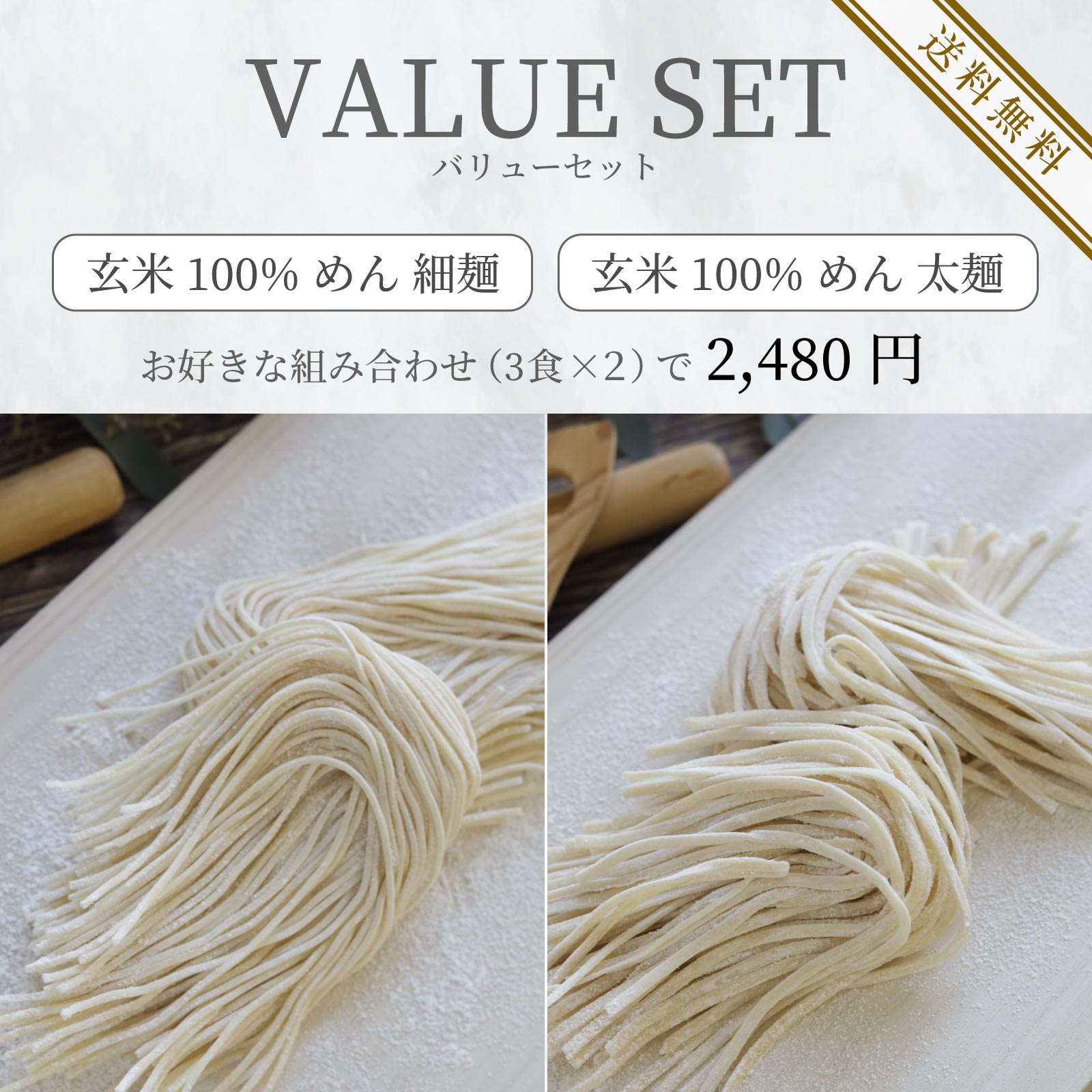玄米100%生めん「細麵タイプ」と玄米100%生めん「太麺タイプ」、それぞれをお好きな組み合わせでご注文が出来ます。
